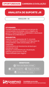 A Sampaio Distribuidora de Aço está em busca de um(a) Analista de Suporte Jr para integrar sua equipe!